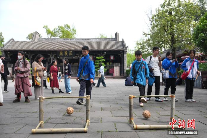 4月1日,四川成都,小学生在玩蹴鞠游戏。中新社记者 安源 摄