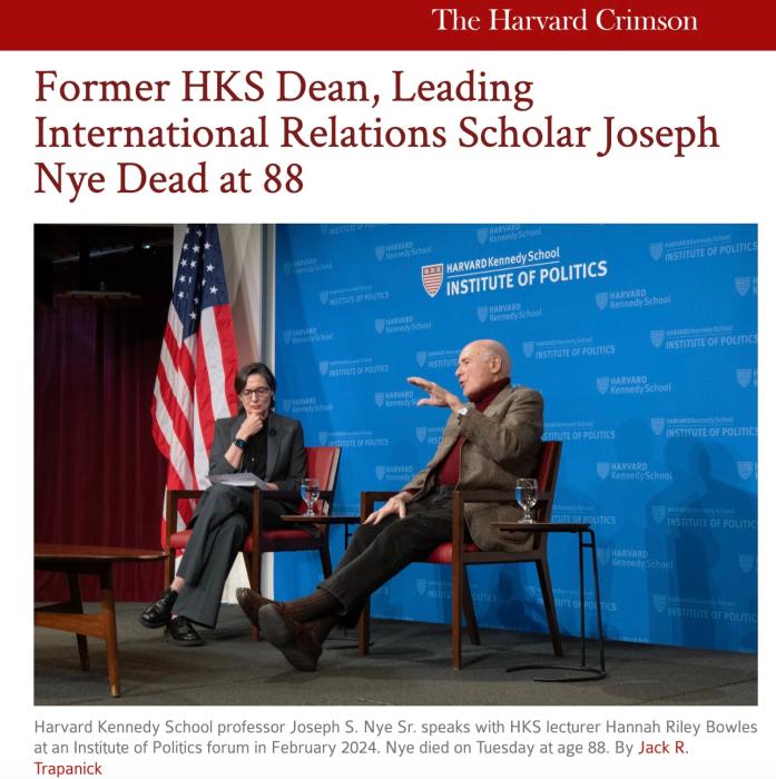 报道称,7日下午,哈佛大学肯尼迪政府学院院长杰里米·温斯坦在给教职员工和学生的电子邮件中宣布了约瑟夫·奈去世的消息。