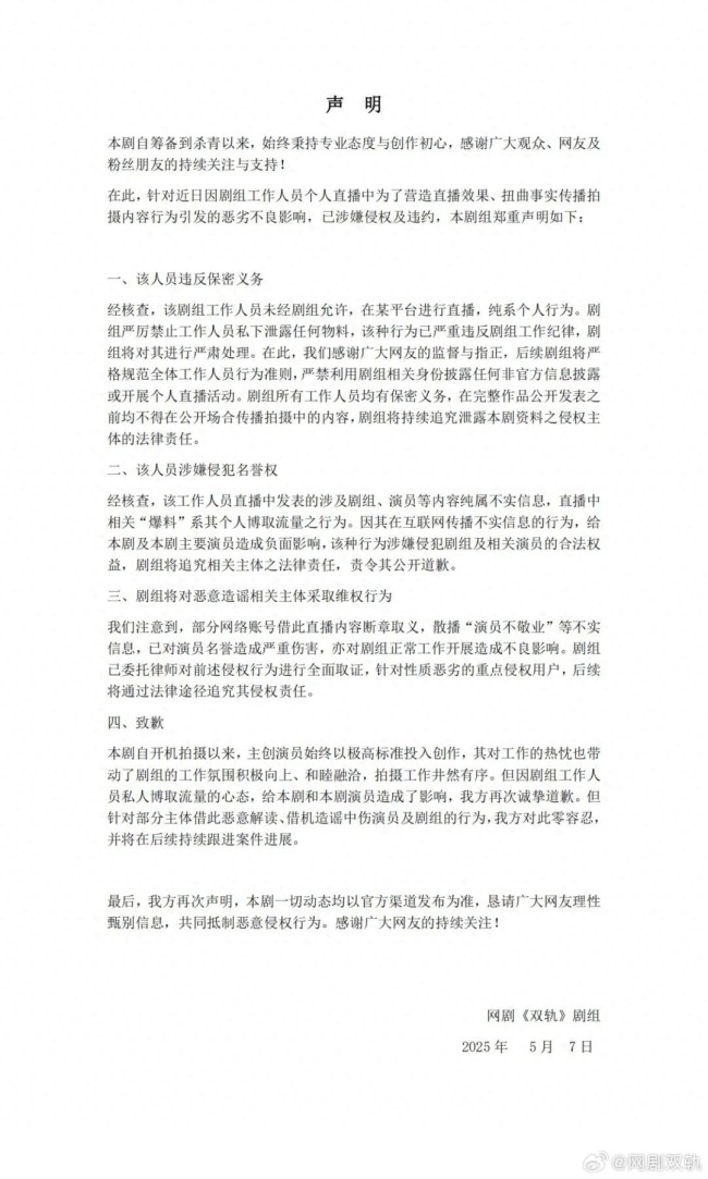 5月7日,网剧《双轨》剧组针对近日因工作人员个人直播引发的不良影响发表声明。该工作人员在直播中为了营造效果,扭曲事实传播拍摄内容,涉嫌侵权及违约。