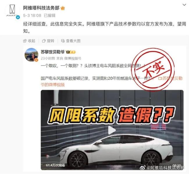 面对质疑,阿维塔科技法务部迅速作出回应。5月3日,阿维塔法务部发表声明,称该博主的言论“完全失实”,并强调所有产品的技术参数均以官方发布为准。在5月3日晚上,阿维塔官方发微博表示,将根据国家专业机构的实验室排期,对阿维塔12进行公开测试,以证明其风阻系数的真实性。