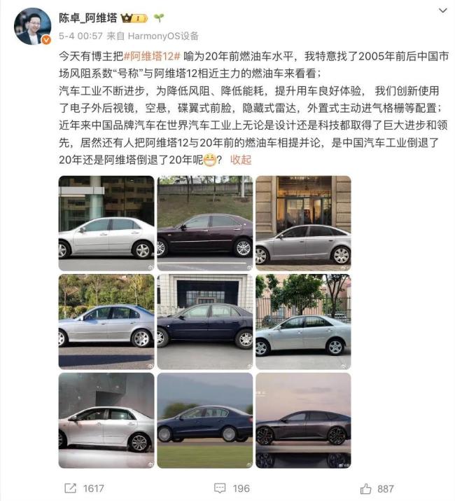 在5月4日,阿维塔的多位高管下场,对此次风阻风波进行解释。阿维塔总裁陈卓表示,为降低风阻、降低能耗,提升用车良好体验,阿维塔12创新使用了电子外后视镜,空悬,碟翼式前脸,隐藏式雷达,外置式主动进气格栅等配置。“近年来中国品牌汽车在世界汽车工业上,无论是设计还是科技都取得了巨大进步和领先,居然还有人把阿维塔12与20年前的燃油车相提并论,是中国汽车工业倒退了20年还是阿维塔倒退了20年呢?”陈卓说道。