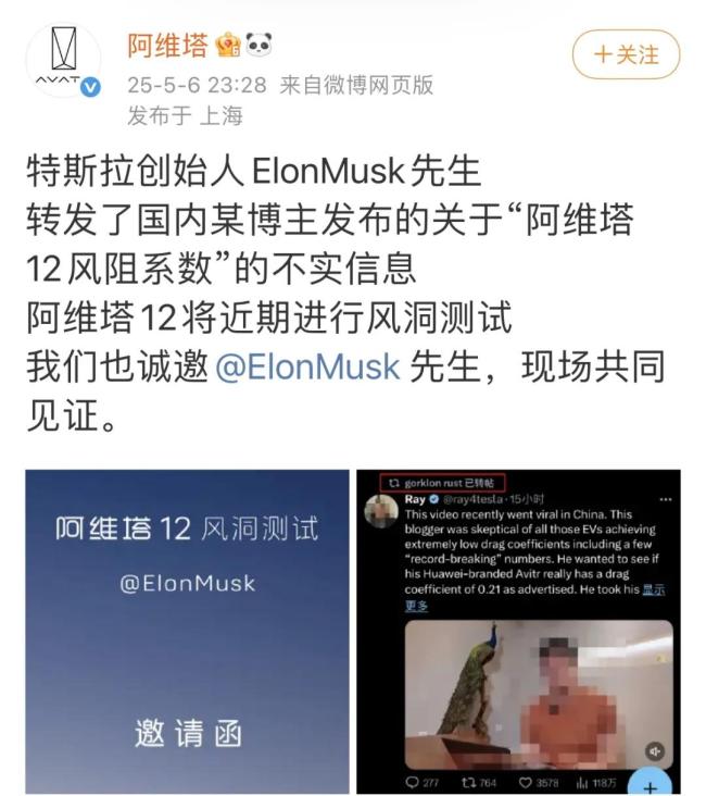 阿维塔风阻被质疑造假的事件的影响范围正在不断扩大。就连特斯拉CEO马斯克,也在5月6日下场转发了相关阿维塔风阻系数疑似造假的帖子,而引发巨大讨论。在当天晚上,阿维塔官方发文作出“硬刚”,称马斯克转发了国内某博主发布的关于‘阿维塔12风阻系数’的不实信息。阿维塔方面表示,阿维塔12将近期进行风洞测试,并邀请马斯克现场共同见证。