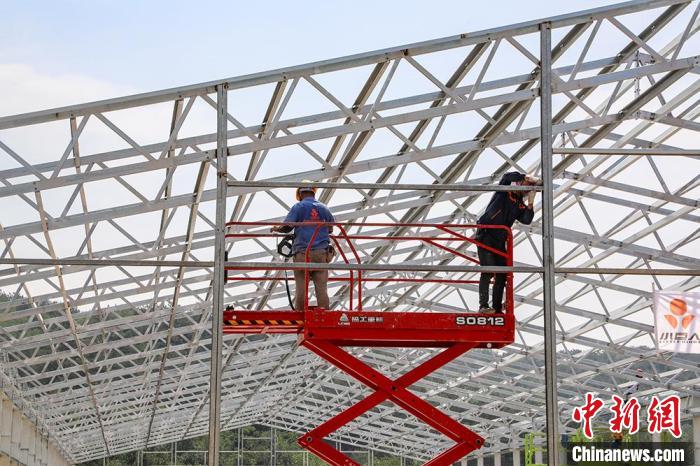 施工人员正头顶烈日进行鸡舍钢结构安装。段云雷 摄