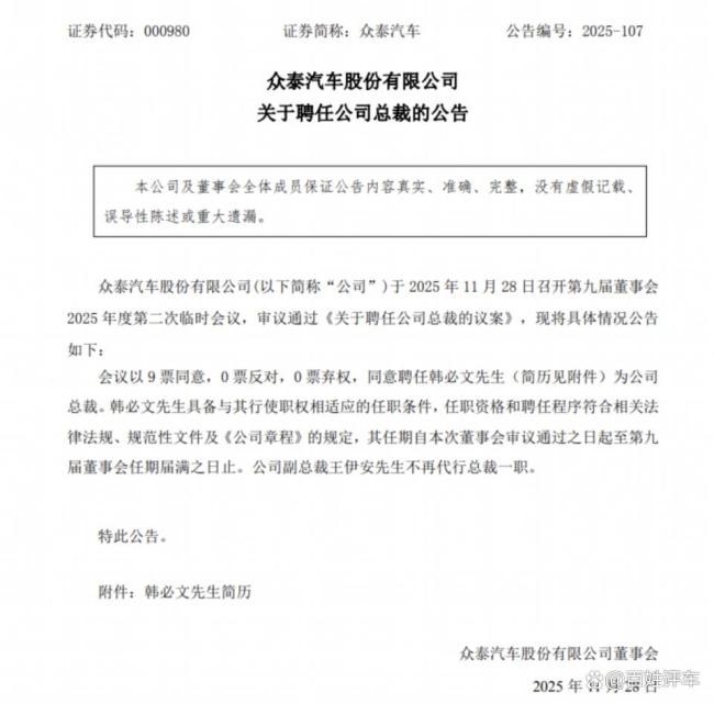 两大巨头携手重组众泰汽车 开启深度系统性变革。日前,众泰汽车发布公告,聘任韩必文为公司总裁,标志着核心高管团队任命工作完成。今年以来,众泰汽车密集推进化债行动、控股股东变更、董事会换届、偿债股票处置以及高管团队调整,实质上开启了一场深度且系统性的重组。