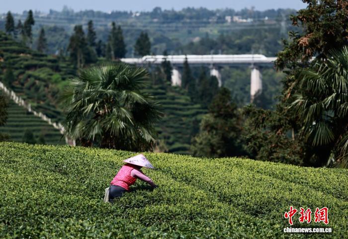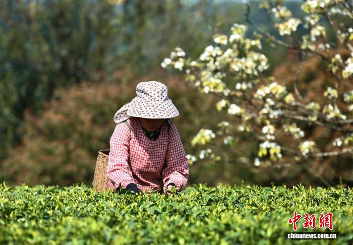 3月20日,正值中国二十四节气的春分,四川省雅安市名山区红星镇骑龙村,茶农在茶园里采摘春茶。中新社记者 王磊 摄
