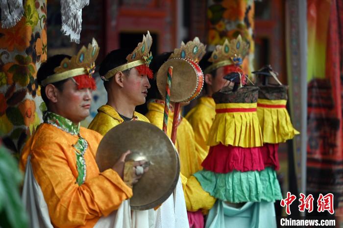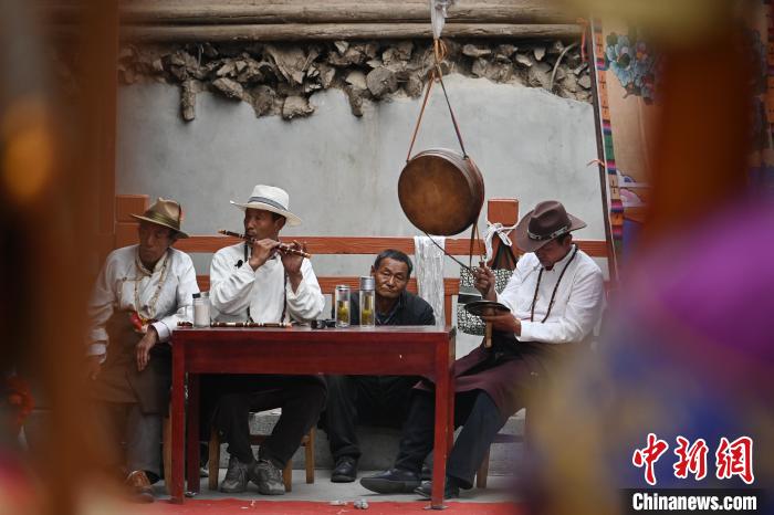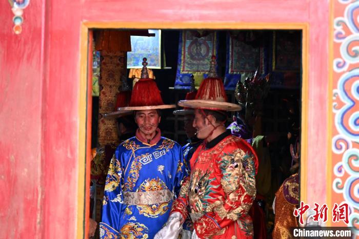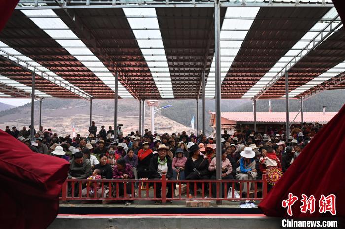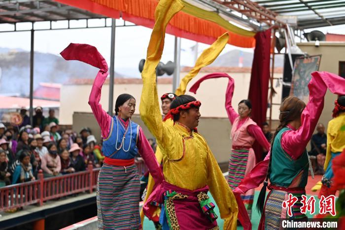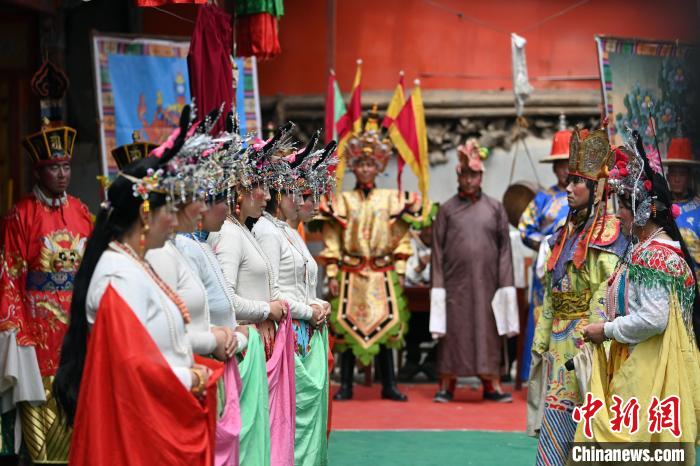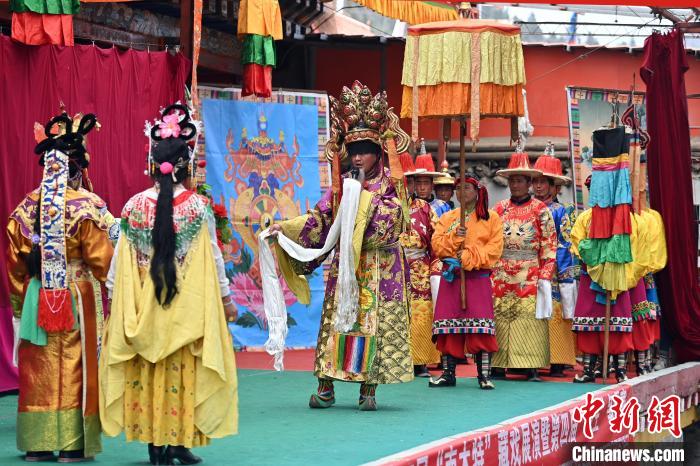 5月7日,在甘肃甘南藏族自治州碌曲县双岔镇二地村,当地村民演绎传统八大藏戏之一的《诺桑王子》。中新社记者 九美旦增 摄