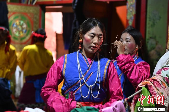 图为演出人员在后台整理服饰准备上台。中新社记者 九美旦增 摄