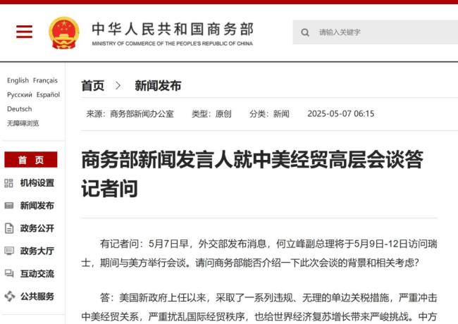 中方表态背后的三点关键信息 美方急谈显露端倪!5月7日清晨,商务部发布了一条重要消息:国务院副总理何立峰作为中美经贸中方牵头人,将在访问瑞士期间与美方牵头人、财政部长贝森特举行会谈。在美方频繁施加关税的背景下,这场即将进行的中美接触备受关注。商务部的通稿中透露了几个关键信息。