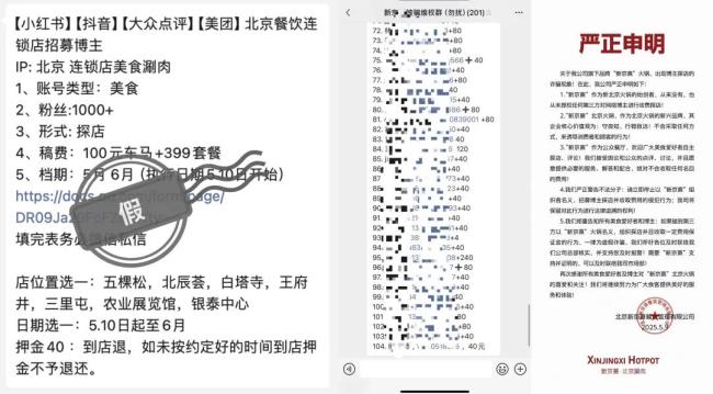 Ann是遭遇该探店骗局的探店博主之一。她回忆称,当时在很多群都看到了这则探店通告,有骗子打着北京知名火锅店新京熹的旗号邀约千粉博主探店,承诺免费双人餐和百元左右稿费。