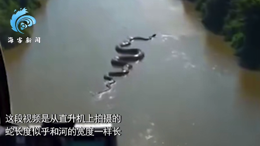 一条巨型蟒蛇在亚马逊热带雨林的河流上滑行,拍摄者是从直升机上拍摄的画面,按照直升机拍摄的高度和视角,这条蟒蛇长度和河流宽度相当,目测得有近百米长!