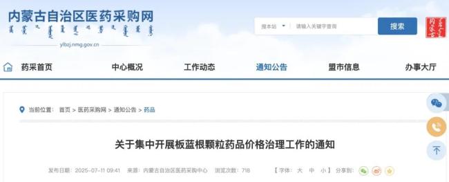 7月10日,内蒙古自治区医药采购中心发布通知,要求企业依据“中成药日治疗费用不高于5元”的原则,重新核算板蓝根(无糖型)的价格。日治疗费用低于5元的,价格治理按5元计,即5元,8袋/日,每袋0.625元。并据此通过差比价规则(无糖型/有糖型=1.1)计算有糖型产品的制剂和包装价格。
