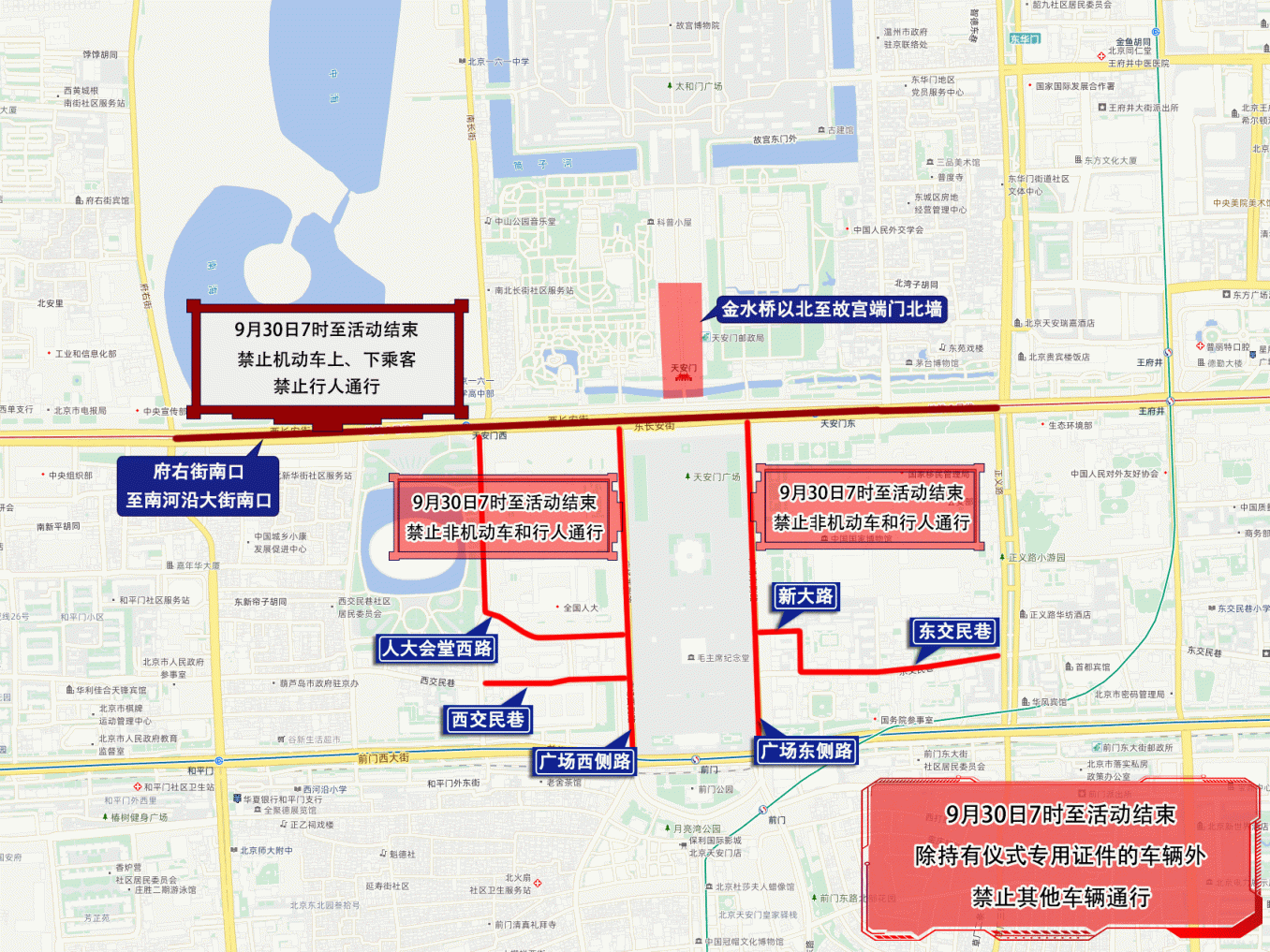 一、9月30日7时至活动结束,人大会堂西路,人大会堂西路与西交民巷交叉口(不含)至西交民巷东口,东交民巷正义路路口(不含)至新大路西口,天安门金水桥以北至故宫端门北墙一线区域,除持有活动专用证件的车辆和人员外,禁止其他车辆和行人通行;