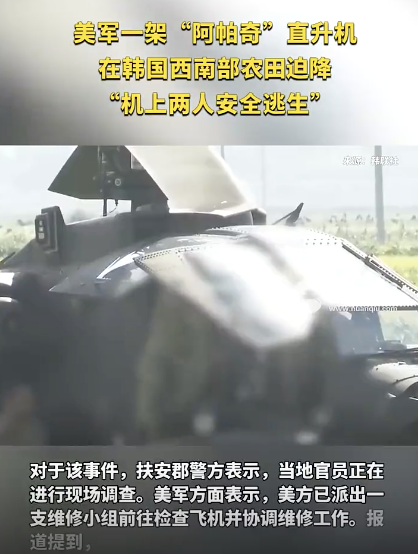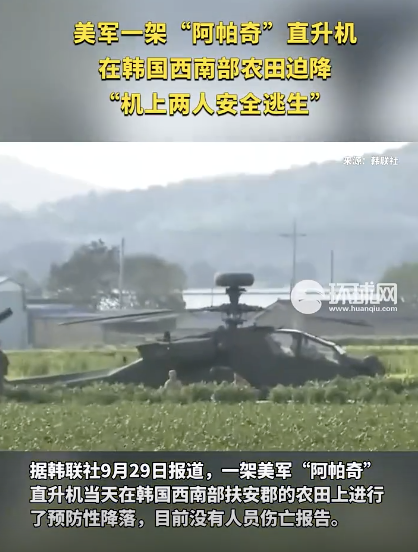 美军一直升机在韩预防性降落。据韩联社9月29日报道,一架美军“阿帕奇”直升机当天在韩国西南部扶安郡的农田上进行了预防性降落,目前没有人员伤亡报告。