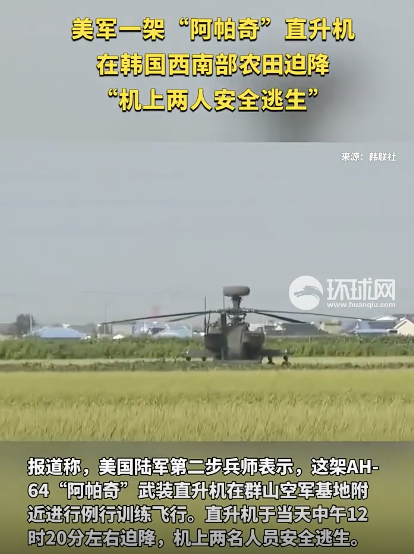 报道称,美国陆军第二步兵师表示,这架AH-64“阿帕奇”武装直升机在群山空军基地附近进行例行训练飞行。直升机于当天中午12时20分左右迫降,机上两名人员安全逃生。