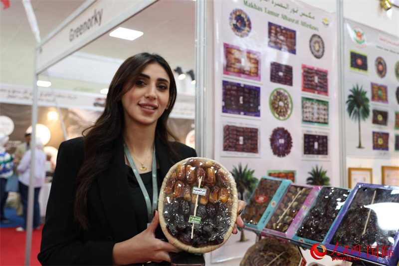 一名参展商展示椰枣产品。人民网 伊纳斯·易卜拉欣摄