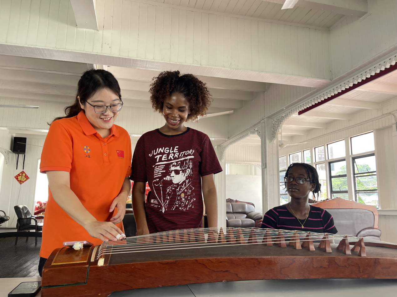 第21批援圭亚那医疗队向当地民众教授古筝。第21批援圭亚那医疗队供图