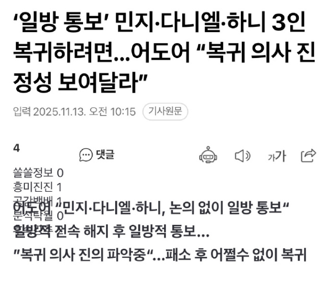 ADOR内部也弥漫着难以立即接受三人回归声明的氛围。有人指出,这种“单方面的回归通报”与去年11月NewJeans单方面通知解约时的情况相似。此外,今后在回归过程中,可能还会出现需要额外协商的条件,情况尚难预料。