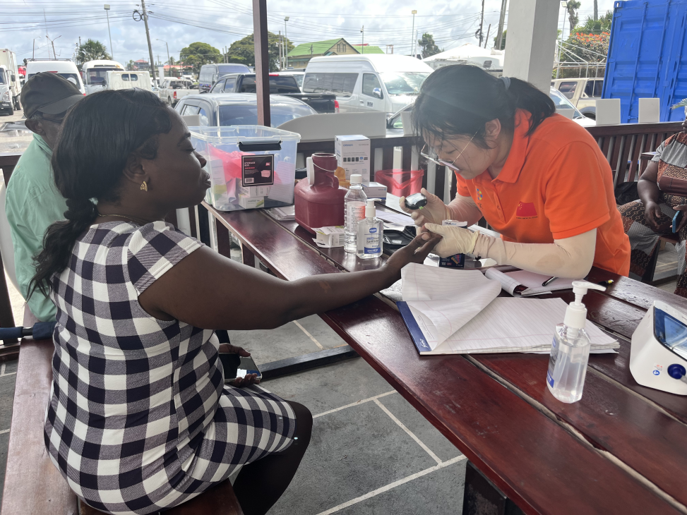 援圭亚那中国医疗队队员为当地民众进行血糖检测。第21批援圭亚那中国医疗队供图