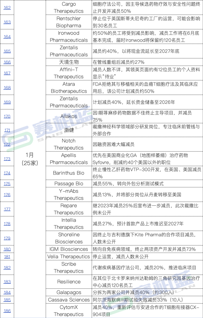 据不完全统计,截至11月26日,2025年已有186家医药企业披露人员精简、工厂关停或研发管线裁撤计划(数据未去重)。这一数量较2024年同期(1-11月)的183家略有增加,减员集中发生在1月、2月、3月及5月,进入下半年后,行业减员规模整体呈收缩态势。