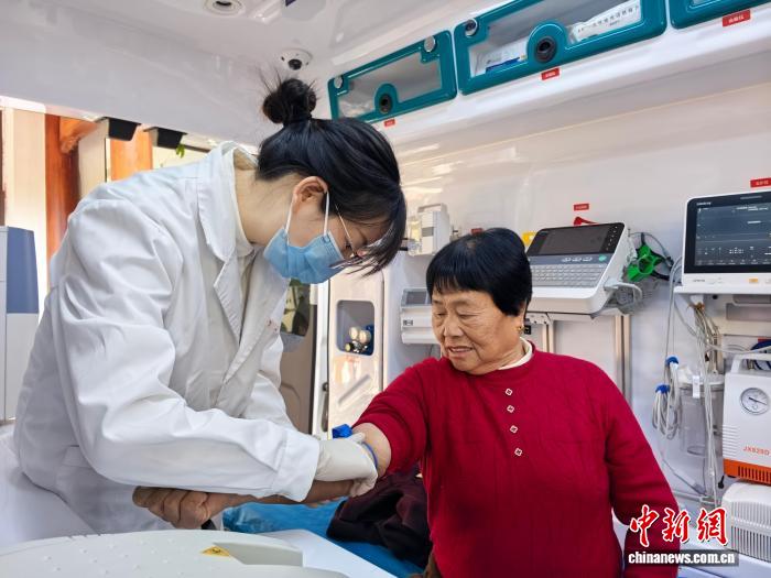 医生在巡回医疗诊疗车上为基层百姓做健康检查。中新社记者 张煜欢 摄