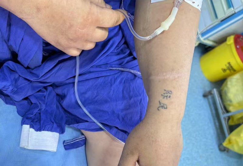 患者刺着汉字“际民”的左手手臂。中国援阿尔及利亚医疗队供图