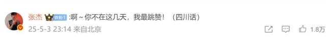 5月3日晚,谢娜也晒出演唱会照片调侃,“杰哥,请问你正在鸟巢开运动会吗?”张杰在评论区回应:“啊~你不在这几天,我最跳赞!”(四川话,意为“很活跃、放得开”)。