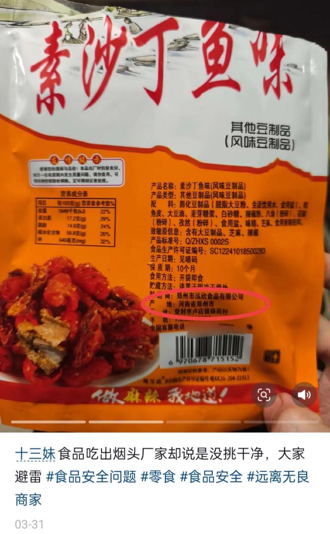 企查查平台信息显示,郑州市泓欣食品有限公司位于登封市卢店镇,2016年成立,共有6条行政处罚信息,包括采购原料未按规定建立并遵守进货查验记录制度等。从2020年至今,多次有网民投诉在该公司生产的食品中吃出异物,如毛发、绳子、纸等。今年3月31日,也有网民发视频称在该公司生产的零食中吃出烟头。
