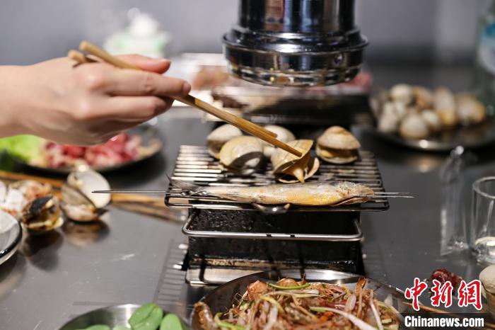 图为食客在烤黄蚬子。中新社记者 于海洋 摄