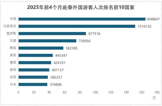 尽管在2025年前四个月,中国依旧以近165万人次的客流量位居泰国第一大海外客源国,但与第二名马来西亚的近152万人次的客流量差距迅速缩小。