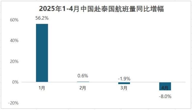 不仅如此,今年1-4月,中国飞往泰国的航班数量分别为4814班、3607班、3326班和3214班,相较2024年同期增幅分别为56.2%、0.6%、-1.9%和-8.0%。