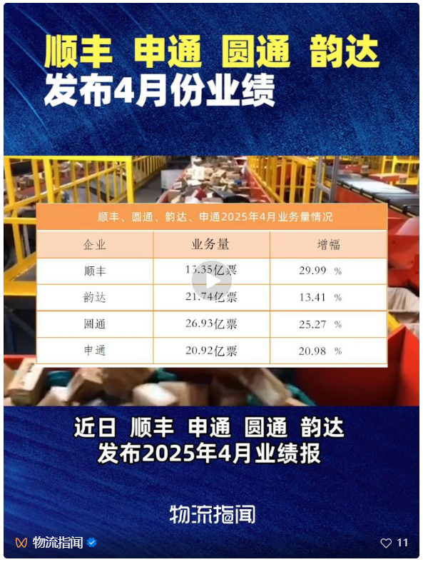 5月20日,顺丰、圆通、韵达、申通四家快递企业发布2025年4月业绩快报。