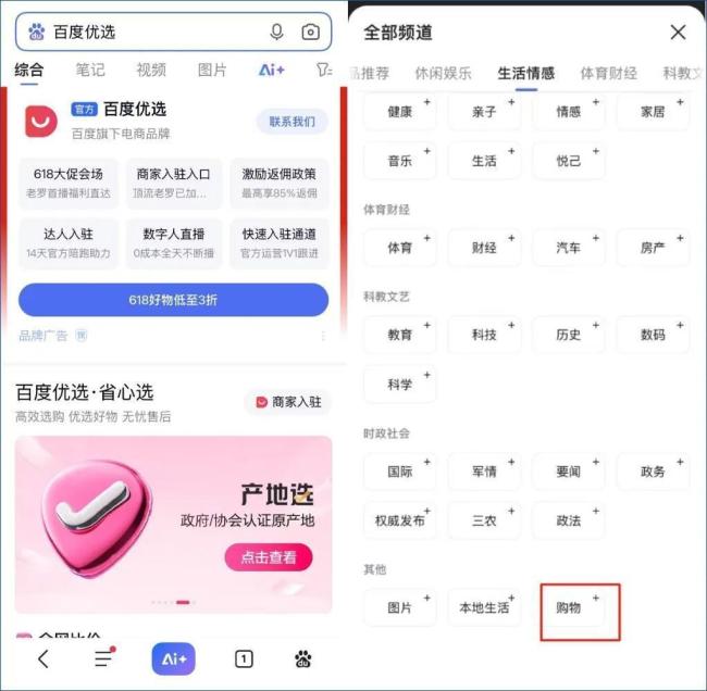 打开百度App,首先出现的信息流页面,下方的四个其他分类分别是“视频”、“AI+”、“消息”和“我的”,整个页面没有“百度优选”的入口。想要访问百度优选,要么自行添加入口(频道定制-购物),要么手动搜索“百度优选”进入。对于电商业务来说,入口隐秘无疑是一个硬伤。