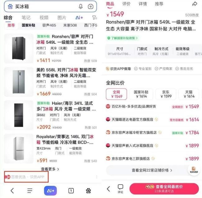 比如搜索“买冰箱”,便会出现一个由百度优选和识货App合作的页面,进入商品页面后有拼多多、京东、天猫等平台的比价信息,点击商品后会跳转至相关平台的App。严格意义来说,百度所谓的与大型电商平台合作,实际上相当于一种引流服务,更接近百度的核心业务——广告。