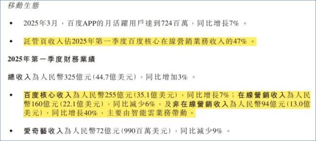 2025年第一季度,百度集团总营收325亿元,其中百度核心营收(不包括爱奇艺)255亿元,同比增长7%;归属百度核心净利润76.33亿元,同比增长48%。