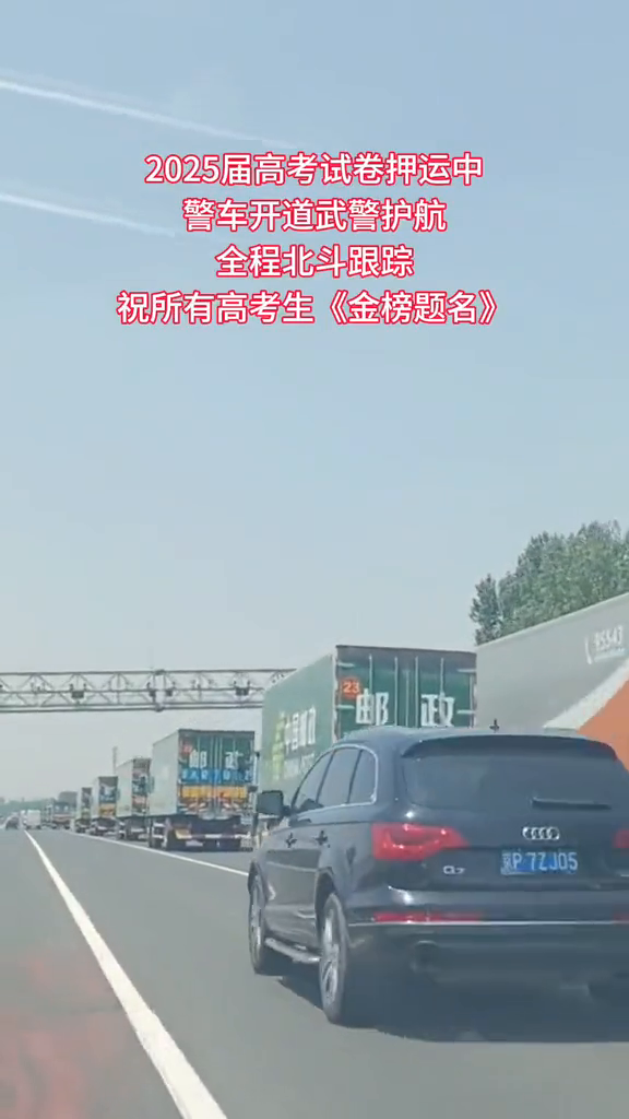 2025届高考试卷押运中,警车开道,武警护航,全程北斗跟踪。祝所有高考生《金榜题名》。近日,有网友称在高速上遇到高考试卷押送车队:16辆邮政车运送,4辆警车全程护航。