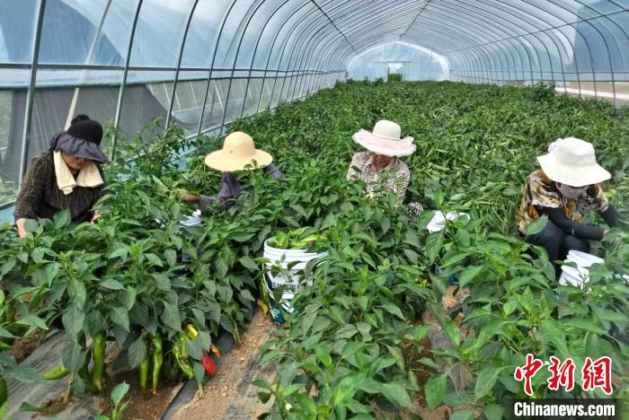 图为西峰区肖金镇芮岭村设施辣椒种植基地工人采摘辣椒。盘小美 摄