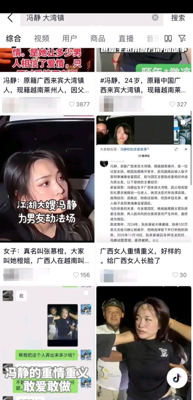 11月18日,柬埔寨柴桢省初级法院发生了一起劫囚事件。当天上午,6名涉嫌跨境电诈和贩毒的囚犯在庭审前被人劫走。现场拍摄到一名女子向囚犯递枪的画面迅速在网络上传播。随后,各类自媒体开始编撰这个“爆款故事”,将涉事女子命名为“冯静”,并将其籍贯锁定在广西来宾市兴宾区大湾镇。故事被包装成“父母逼婚嫁老头,逃婚后被卖至柬埔寨电诈园区,遇‘大哥’阮依豪相救,为报恩情带枪劫狱”的江湖叙事。更有传言称阮依豪曾赠予她百达翡丽手表和100万美元,两人是“生死相依的情侣”。