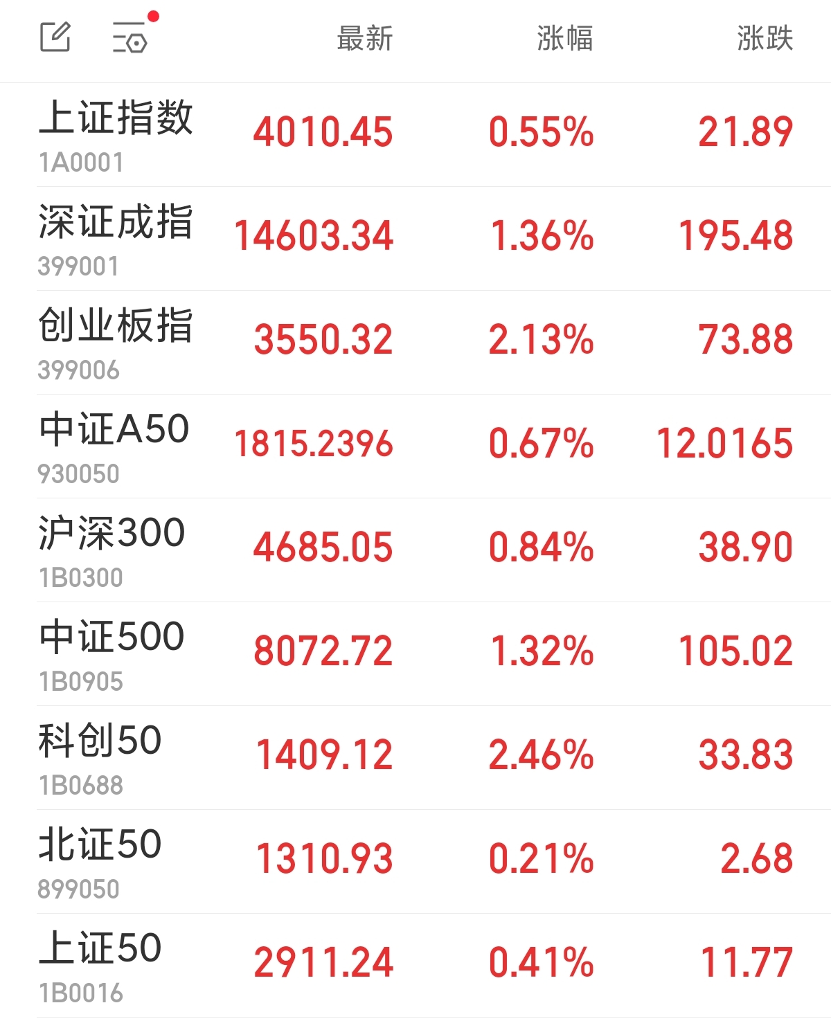 中新经纬4月14日电 周二早盘,A股三大指数高开高走。截至午间收盘,上证指数涨0.55%,报4010.45点;深证成指涨1.36%,报14603.34点;创业板指涨2.13%,报3550.32点。